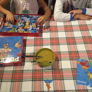 O pai e o mano mais velho não estavam, e a mamã aproveitou para um jantar diferente. Por entre garfadas, cada um dos filhos tirava uma peça do puzzle dos países e tinha de dizer o que sabia (se soubesse) sobre esse país. A mãe dizia também o que sabia, e depois íamos perguntar o Google o que ele sabia. E não é que ele sabia sempre mais do que nós?